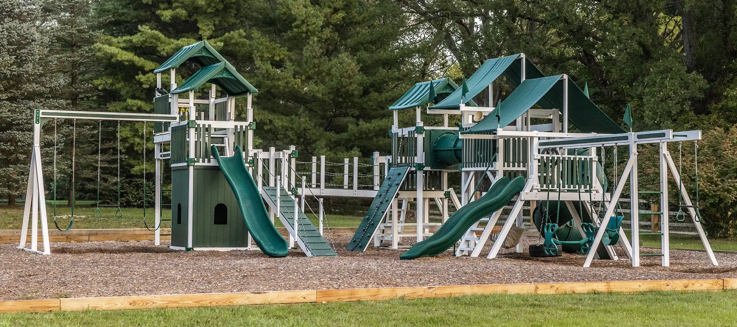We are proud to be one of the largest playset distributors in Michigan, offering several models of Amish-made vinyl playsets for order or pickup from either of our locations. We carry a full line of both residential and commercial Adventure World Playsets. All of our playsets are constructed with pressure treated wood for structural elements, covered with durable vinyl, then finished with stainless hardware and the highest quality parts and accessories.