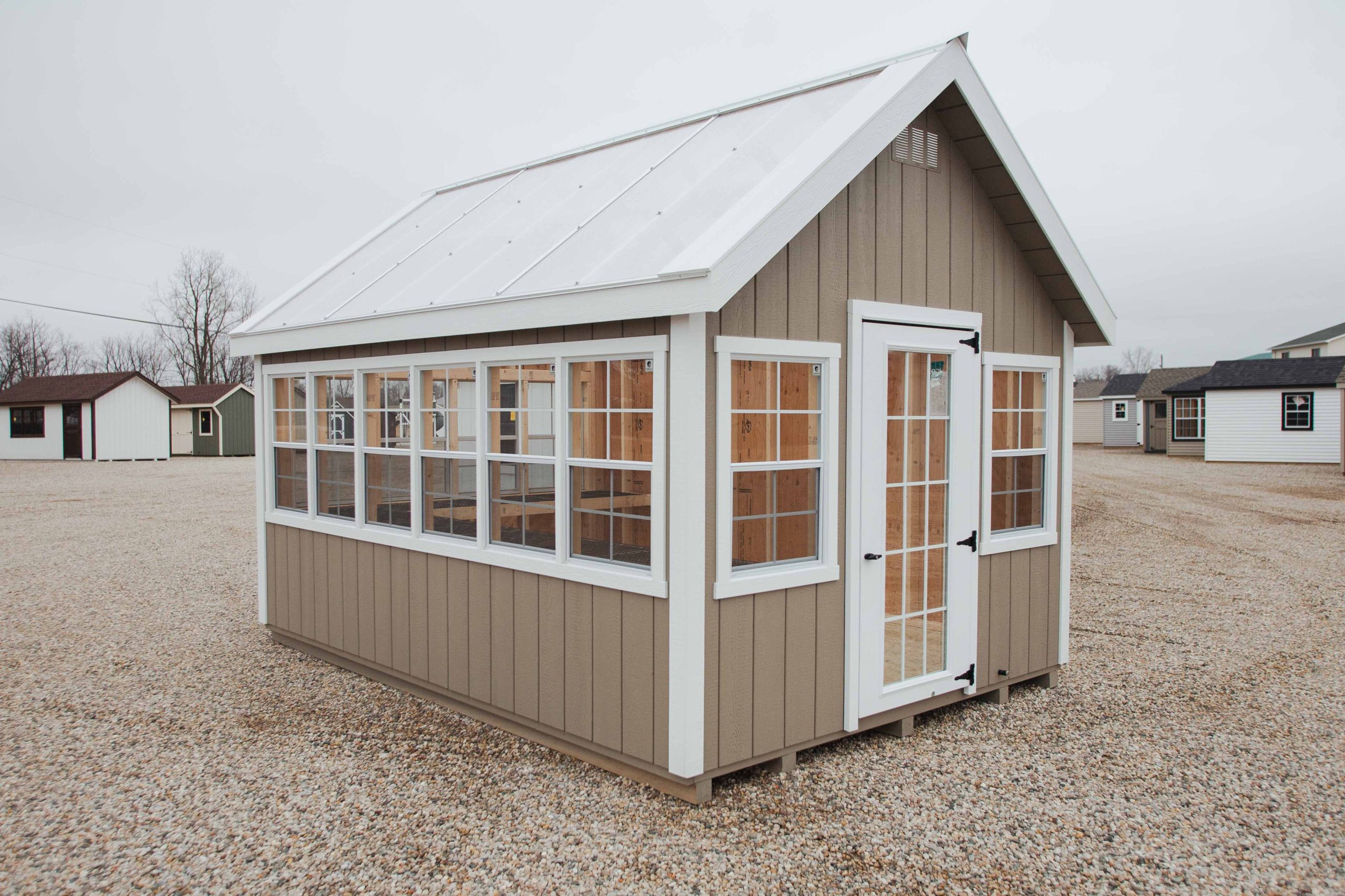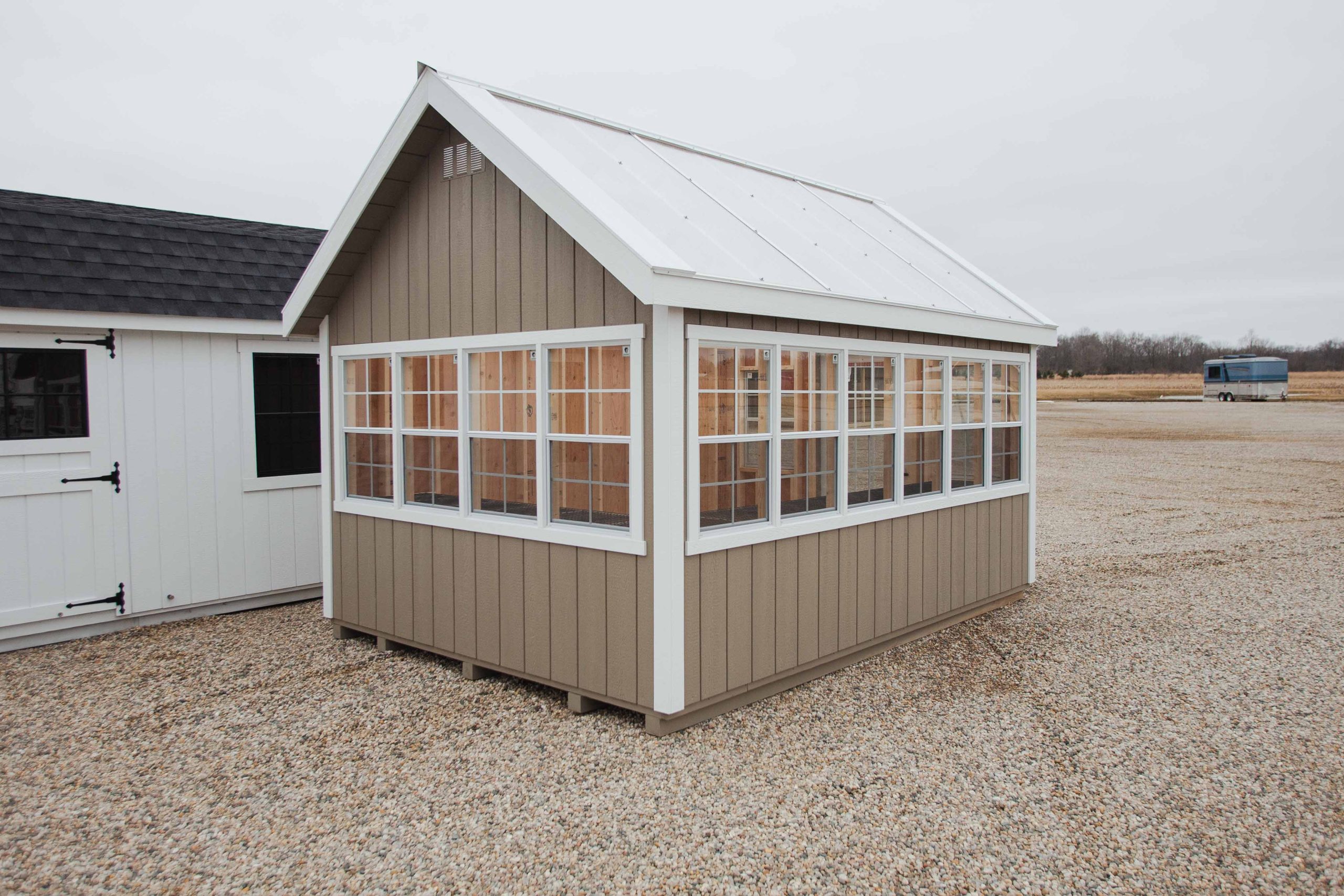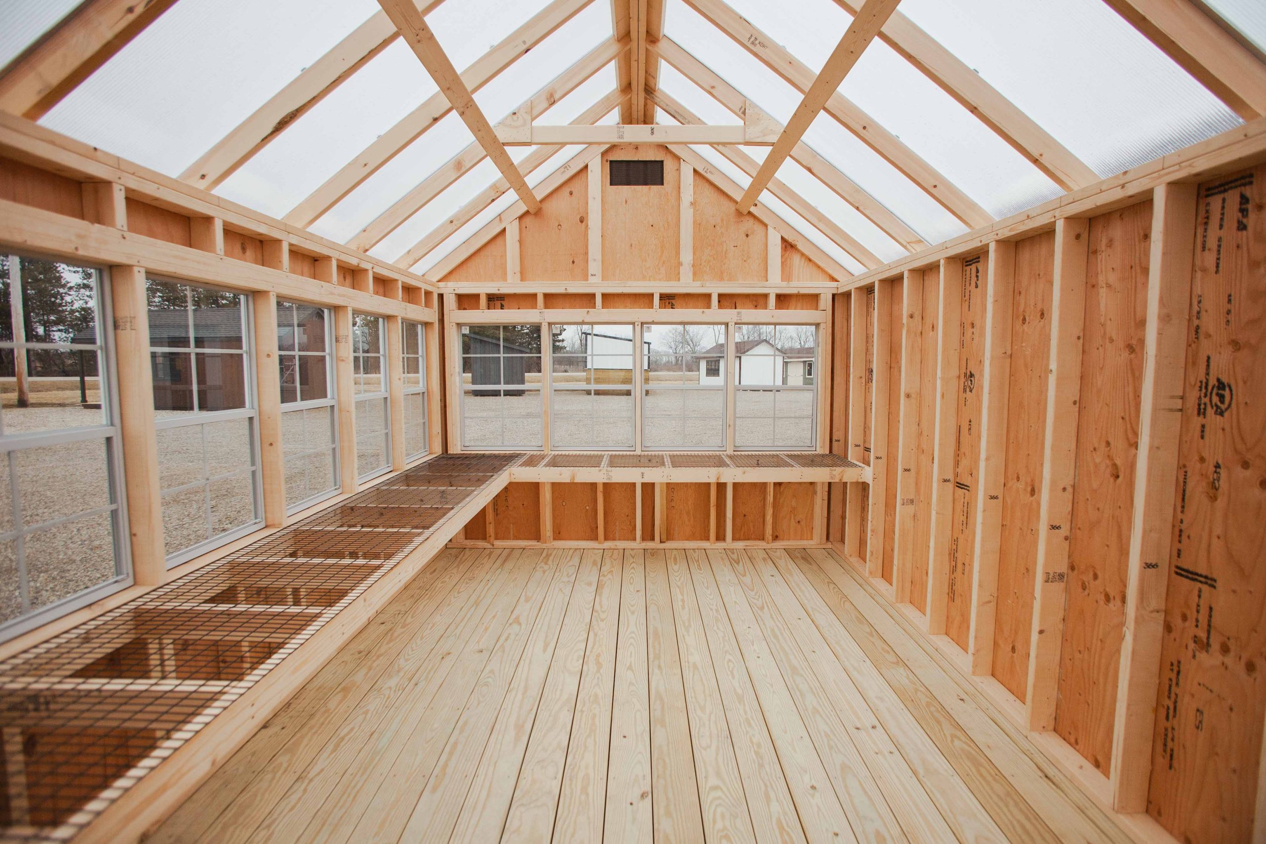 10×14 Alpine Greenhouse, clay/white/clear, 10 additional 24×36 trimmed windows, 24″ workbenches, paint top of trusses, 5/4 decking, upgrade to 15-lite single door, smoothwall poly roof.