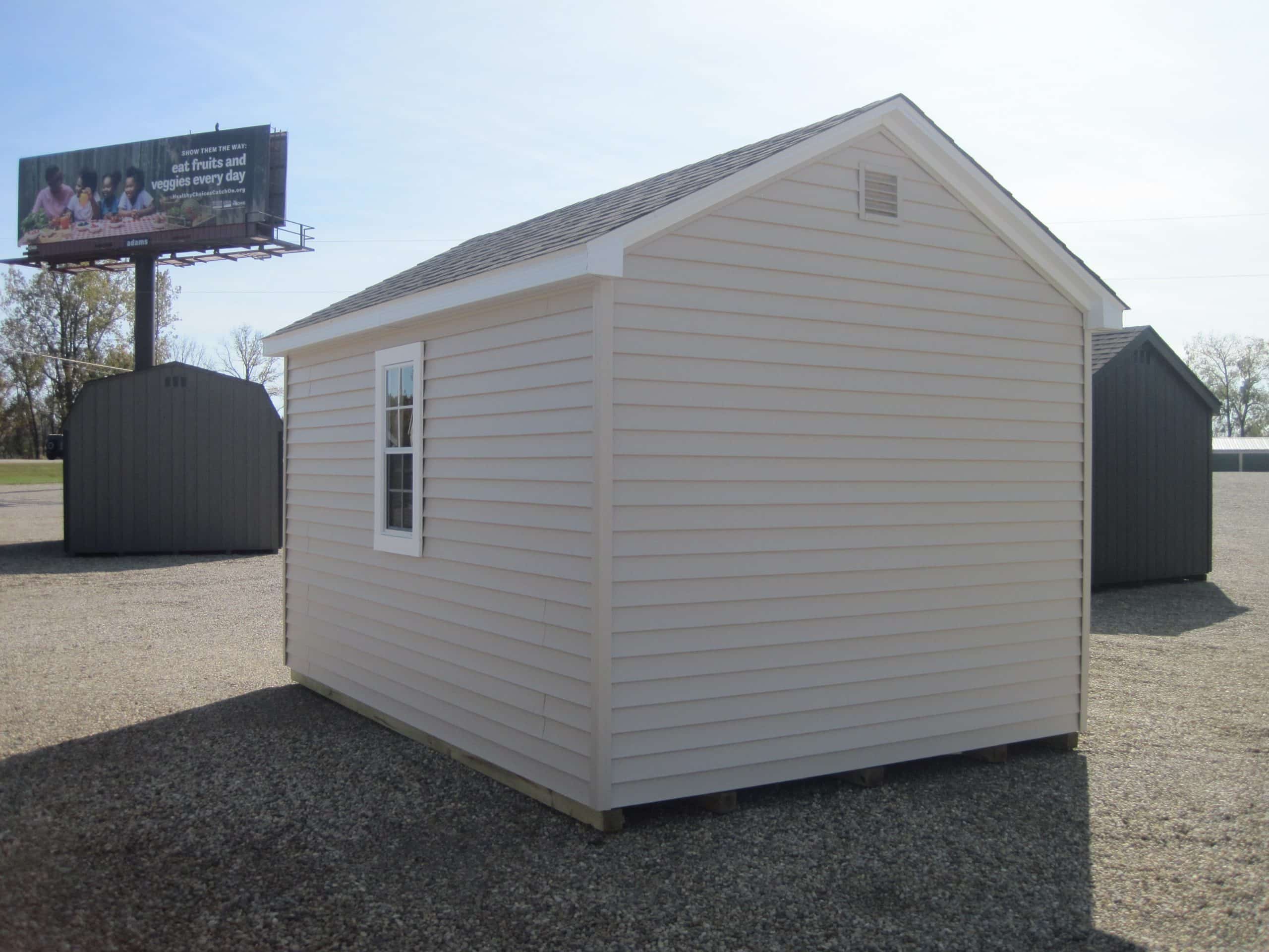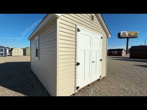 10×14 Vinyl 7′ Cape, sandalwood/white/weatherwood, craftsman doors, door plate
