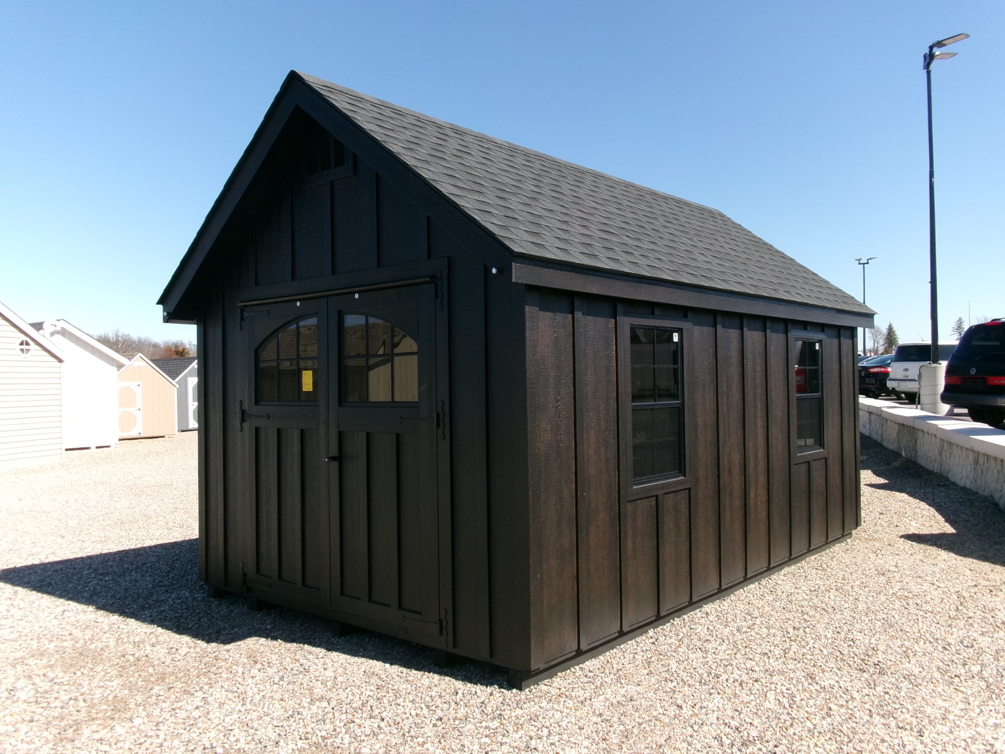 10×16 Board and Batten Alpine, ebony/ebony/black, 1 extra 24×36″ window, no shutters, 2- 1/2 arched windows in double mansion doors, 16″ 2×4 shelf, 2 arched trim, door plate, 6′ wide doors, urethane stain, magnets