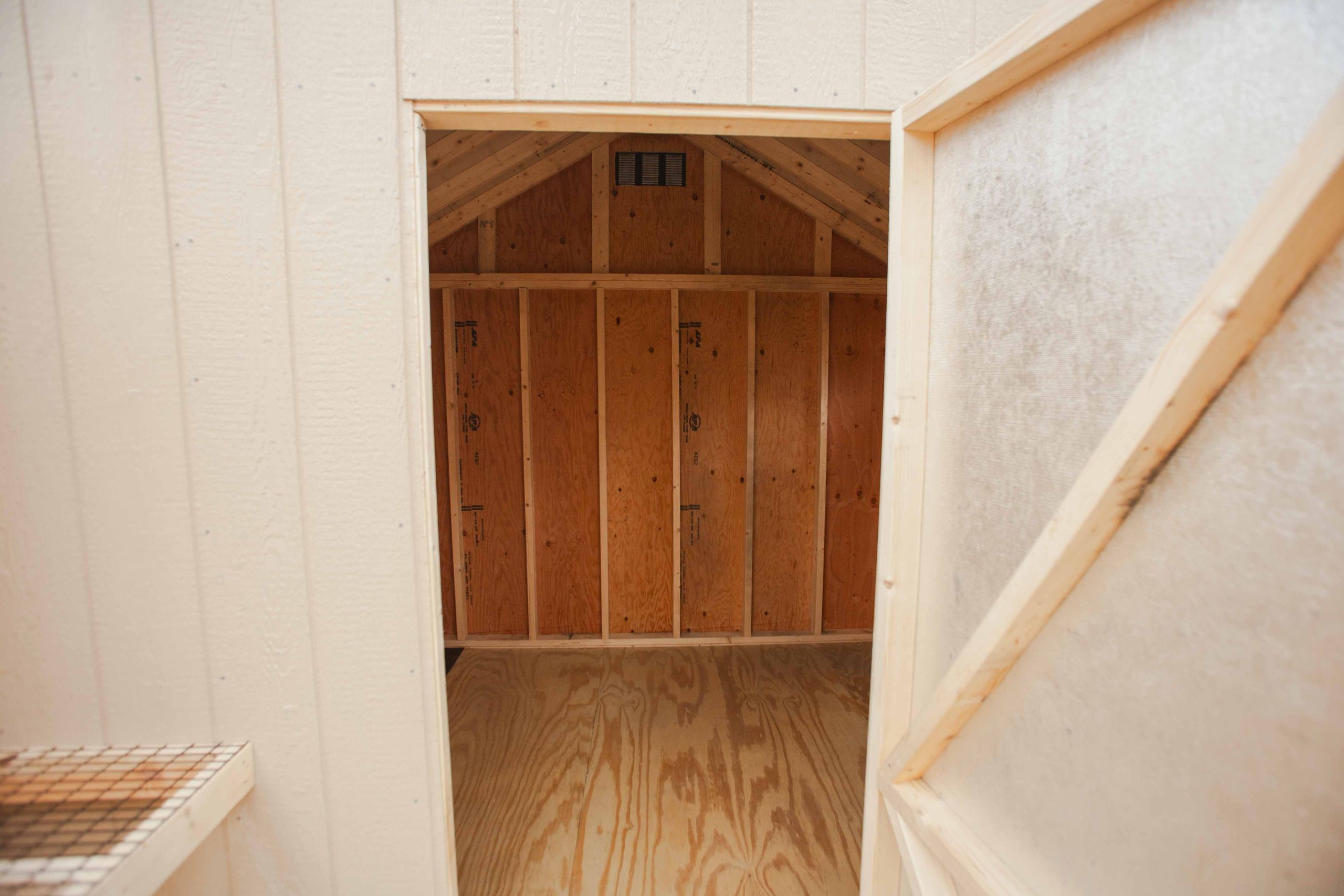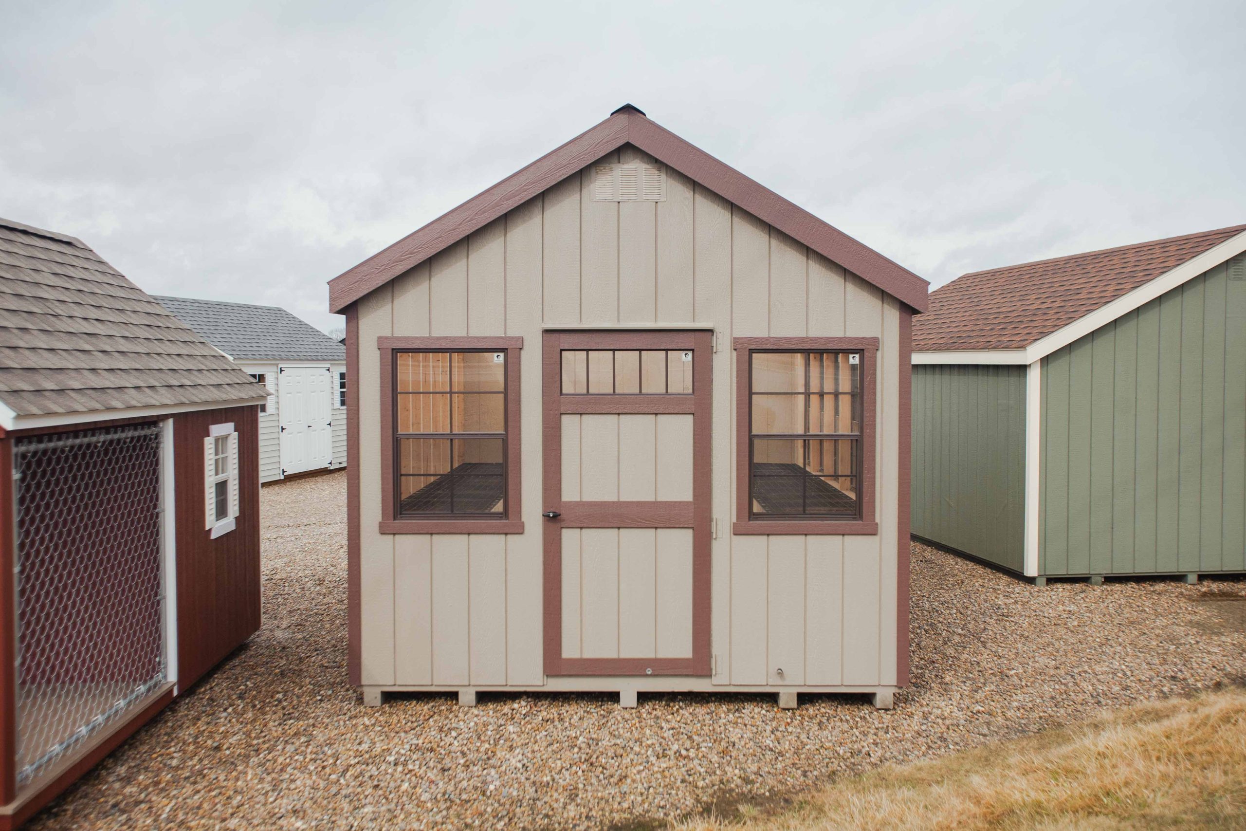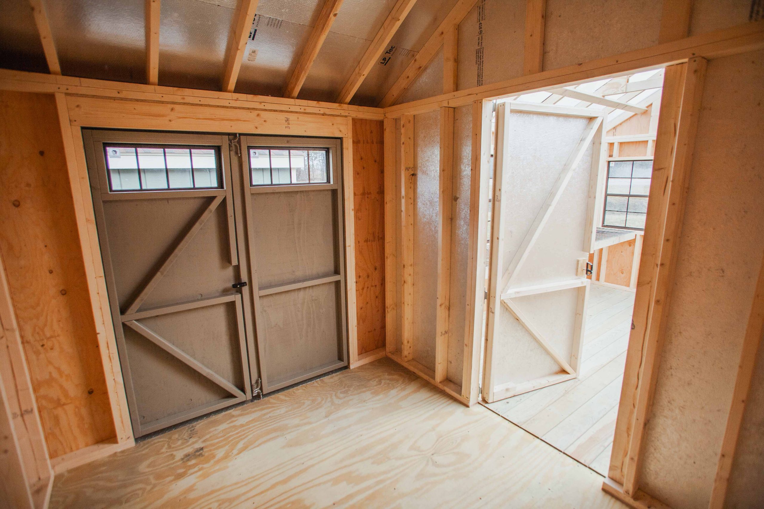 10×20 A-classic Combo Greenhouse, clay/charcoal brown/hickory, 5 additional 30×36 windows with trim, additional 3′ german door, windows in 3 doors, door plates, treated 5/4 deck boards in 10×12 area, 10′ partition, german door in partition, 2- 12’x24″ coated wire workbenches, smooth wall poly in 10×12 area, tops of rafters painted.