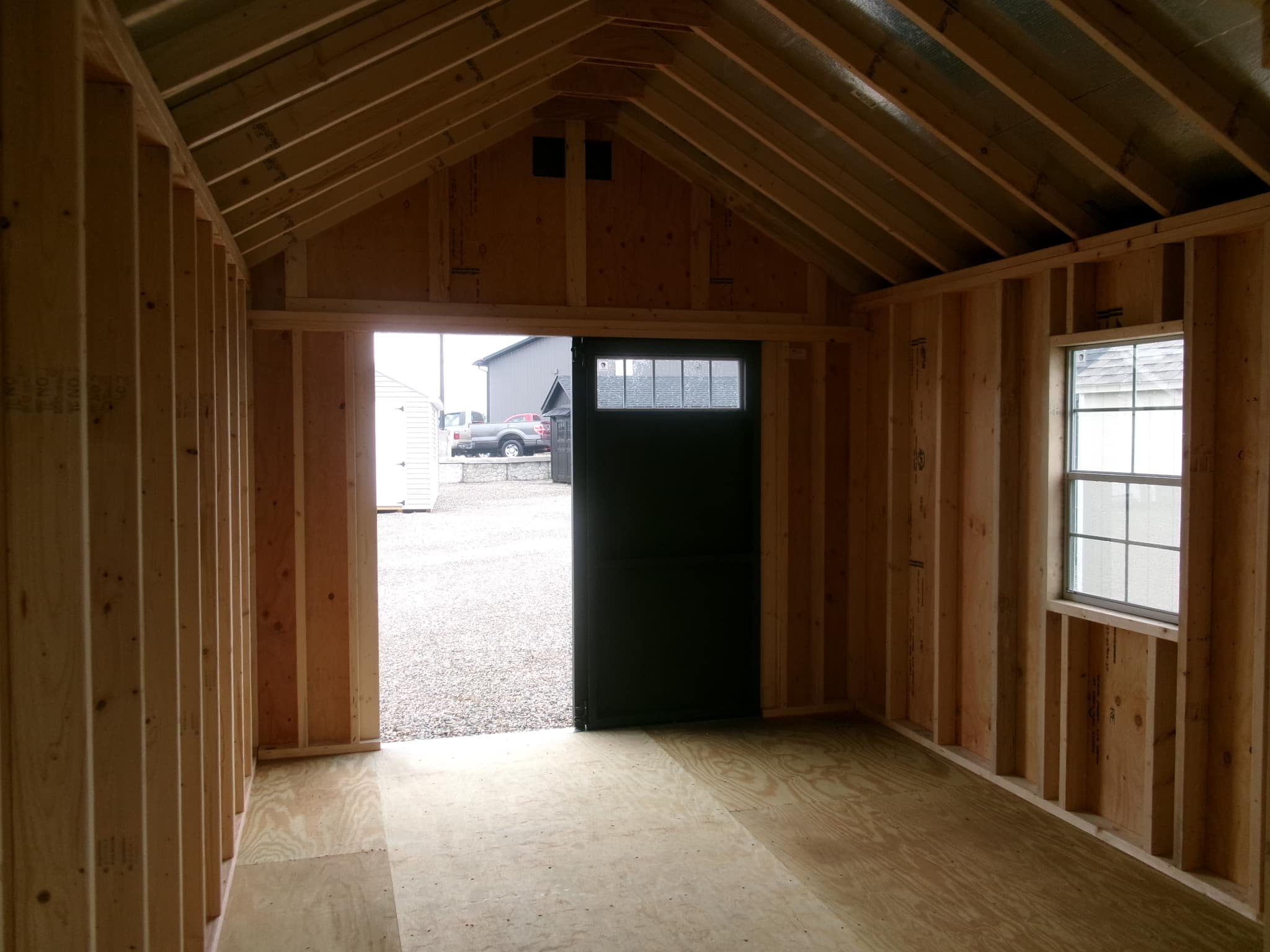 10×20 Cabin, Iron Ore/white/black, 1×4 trim instead of shutters, door plate, 6×8 loft loft, magnets, picture frame decking