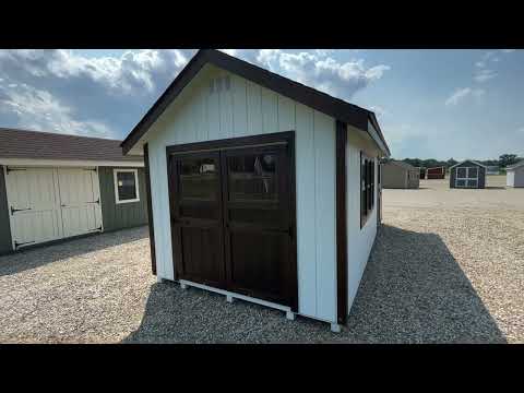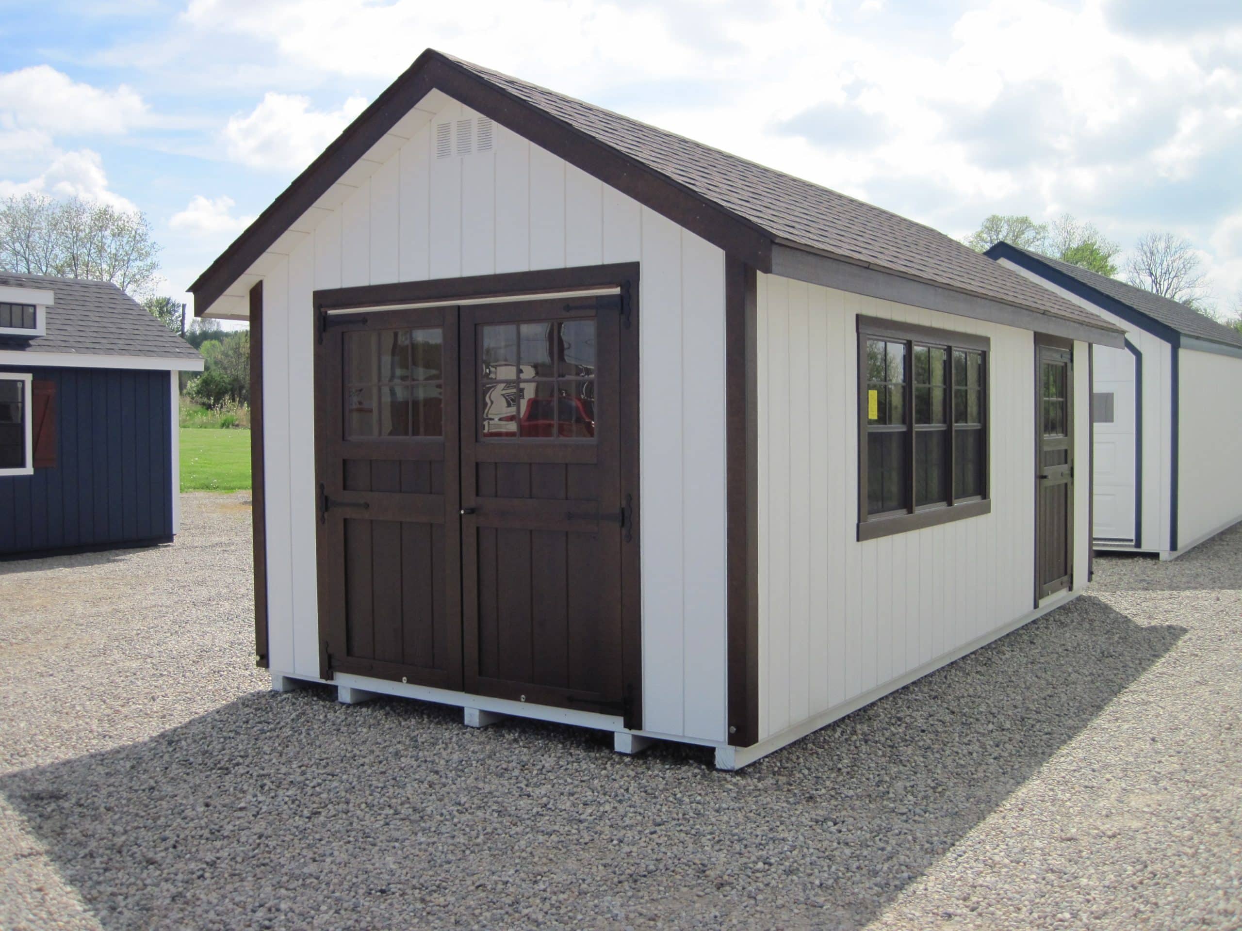 10×20 Cape Cod Deluxe, White/Chestnut Stain/Hickory, Stained trim & doors, Less one set of shutters, 6-Lite wood windows in doors x3, Extra Mansion Door w/ Door Plate, Door Magnets.