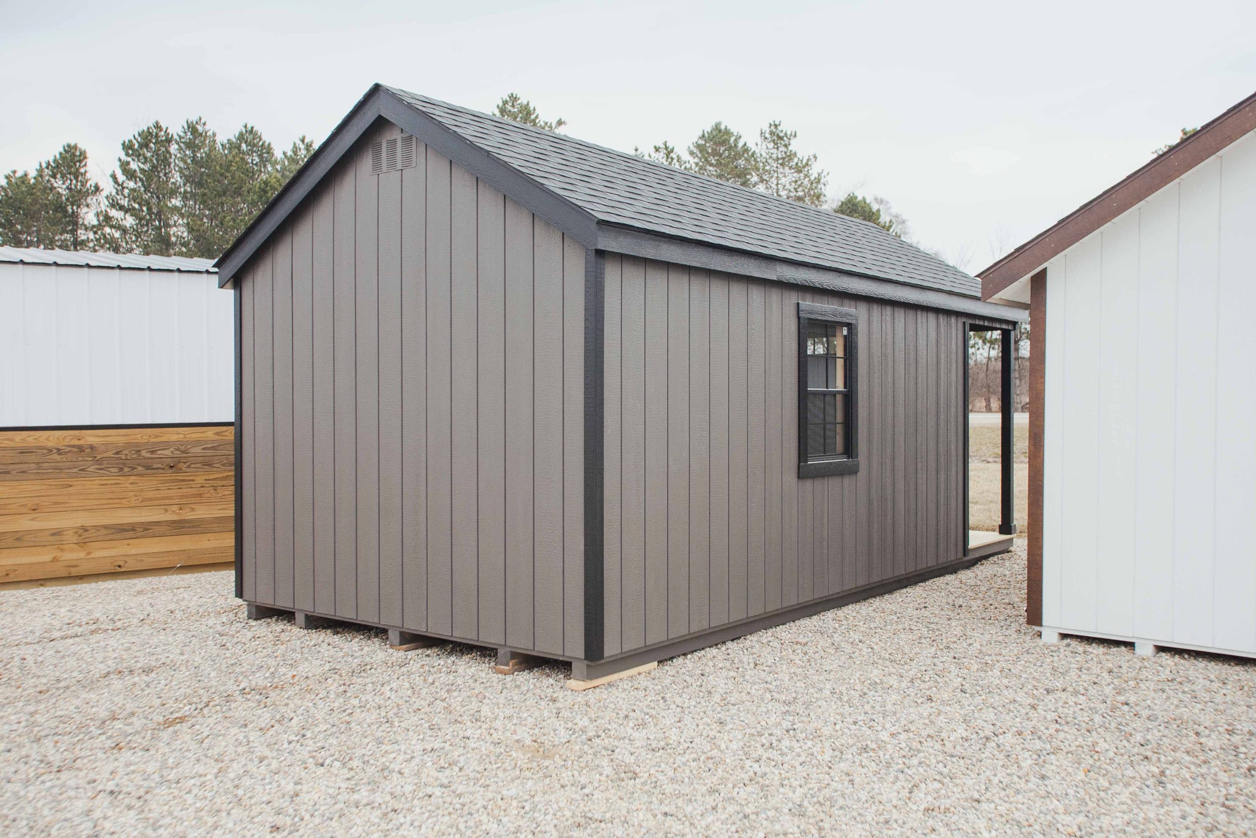 10×20 Colonial Classic w/ full porch, burnished slate/black/black, additional window and trim, no double doors, one transom, 3′ mansion door instead of german door, door plate, full porch, no railing, custom color, no cupola.