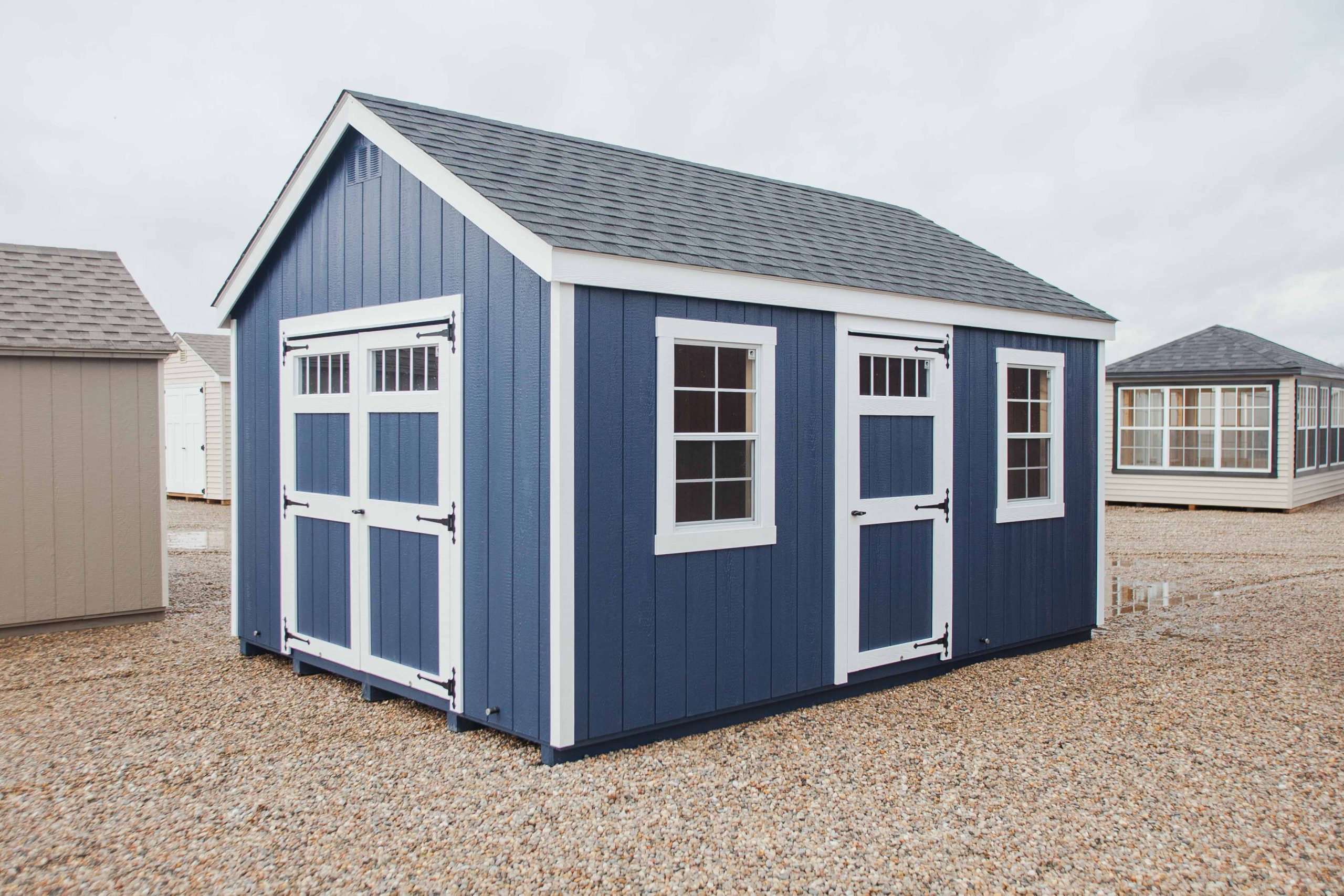 12×16 A-Frame Classic, naval/white/black, trim windows instead of shutters, upgrade to double mansion doors, additional single mansion door with windows, fancy hinges, door plates.