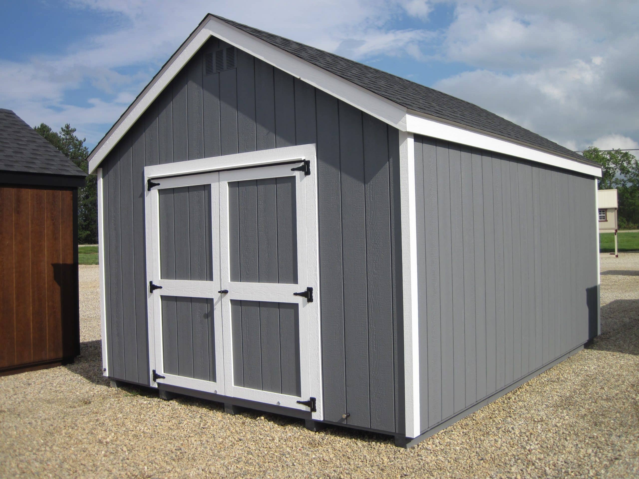 12×16 A-Frame Classic, dk. gray/white/black, 1×4 window trim instead of shutters, upgrade to mansion double, additional 3′ mansion door, door plates, magnets