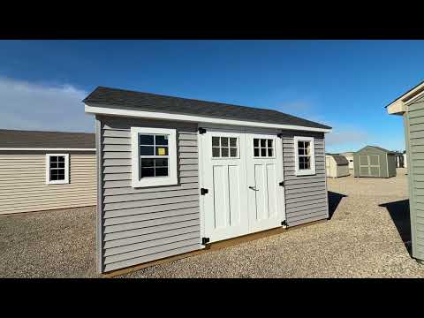 12×16 Vinyl 7′ Cape, pewter/white/black, 6′ wide craftsman doors w/ windows, door plate.