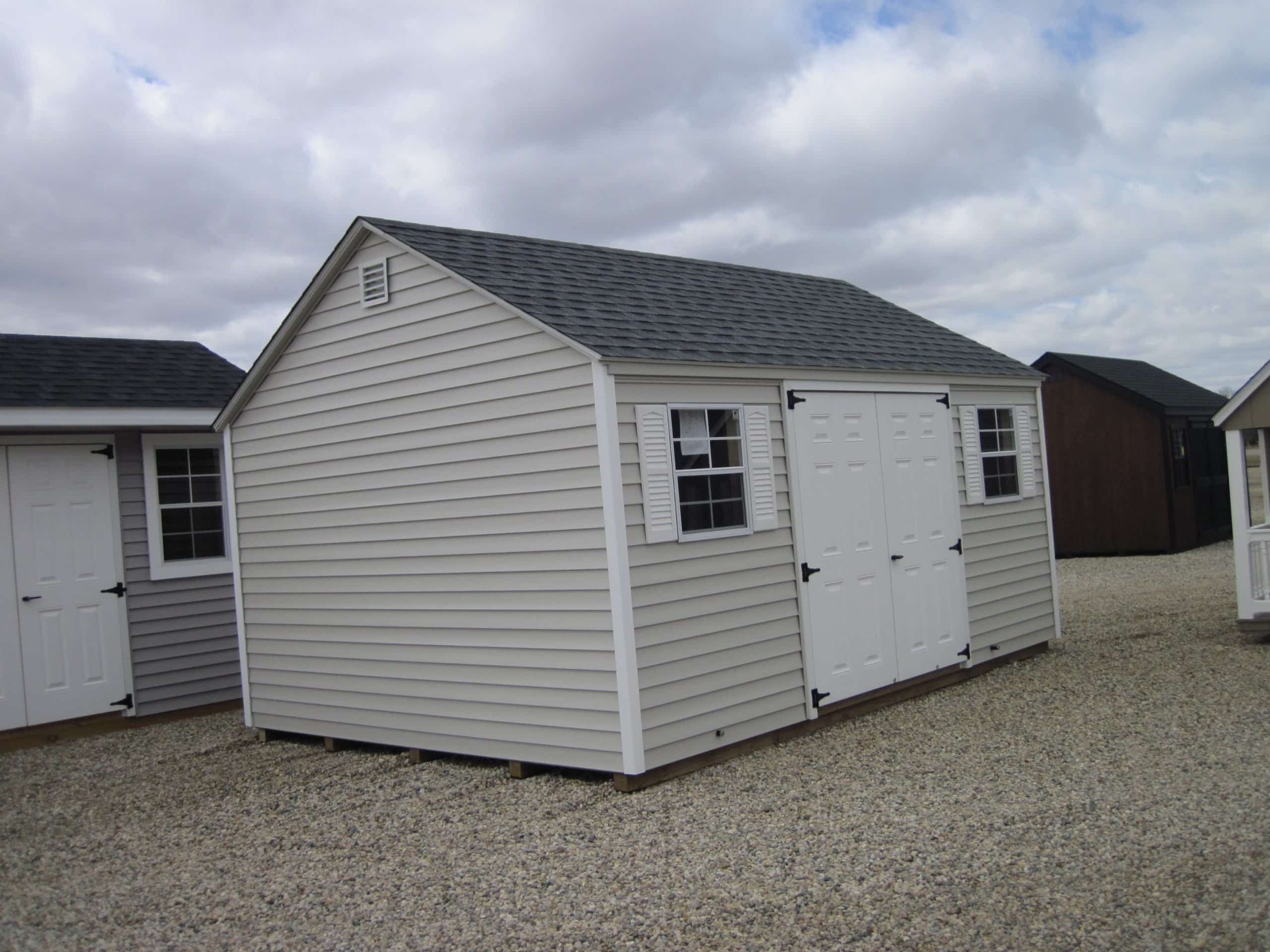 12×16 Vinyl A-Frame, mist/white/pewter, door plate, 6′ wide doors, 24″ 2×4 loft