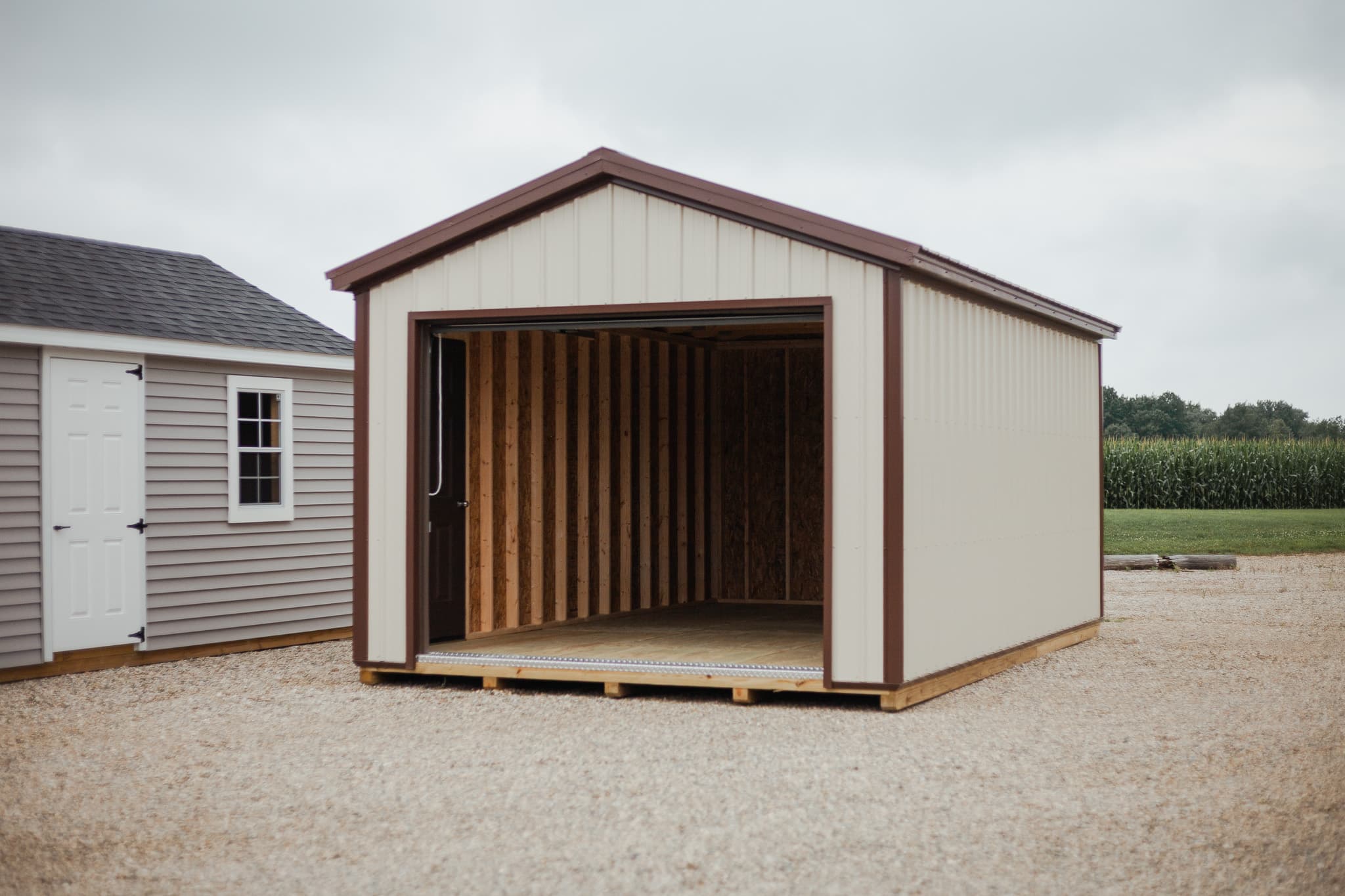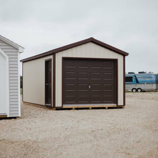 12×20 Metal Cape Garage, lt. stone/brown/brown, 9×7′ insulated garage door, door plate, prehung door, no windows.