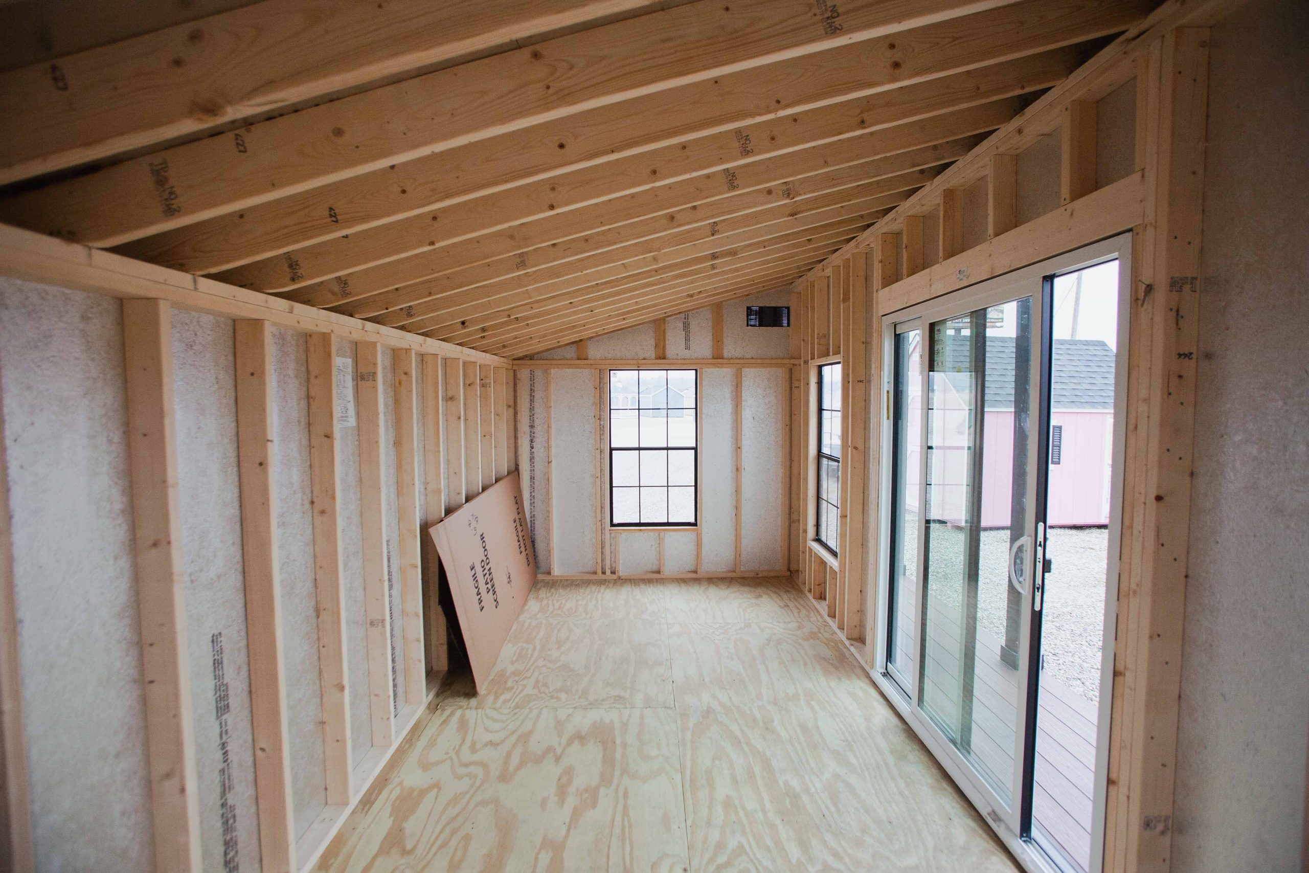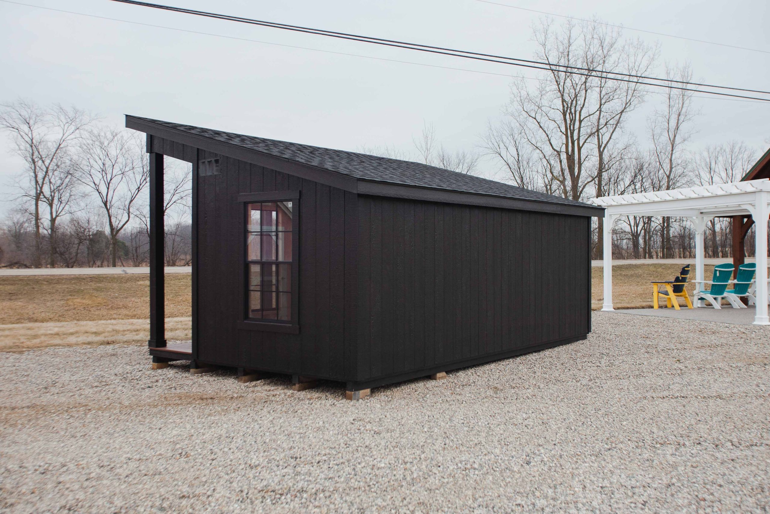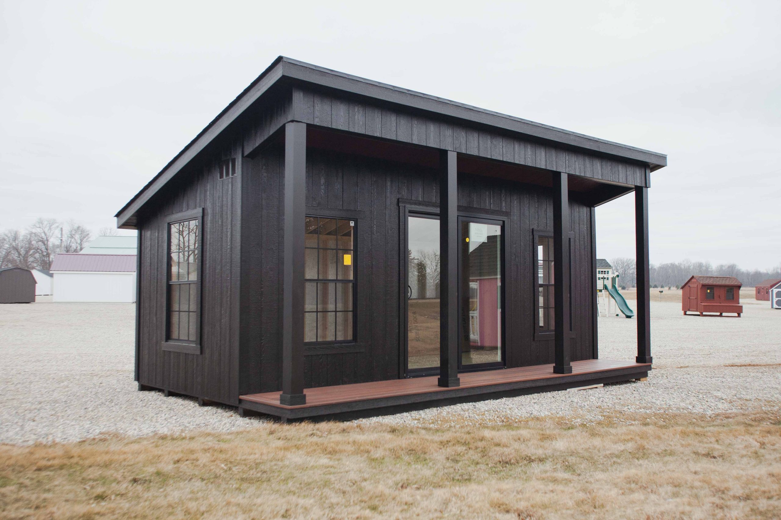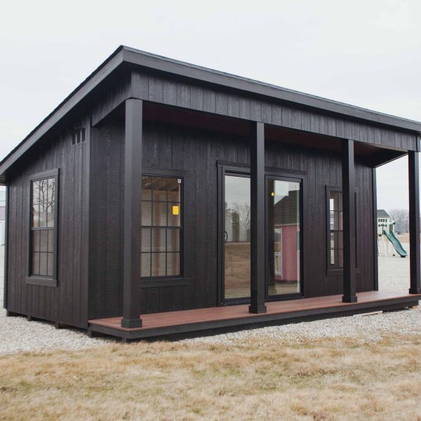 12×20 Studio w/ Porch, Ebony/Ebony/Black, 4-30×54 Trimmed windows, Black sliding door, Composite decking, No transom windows.