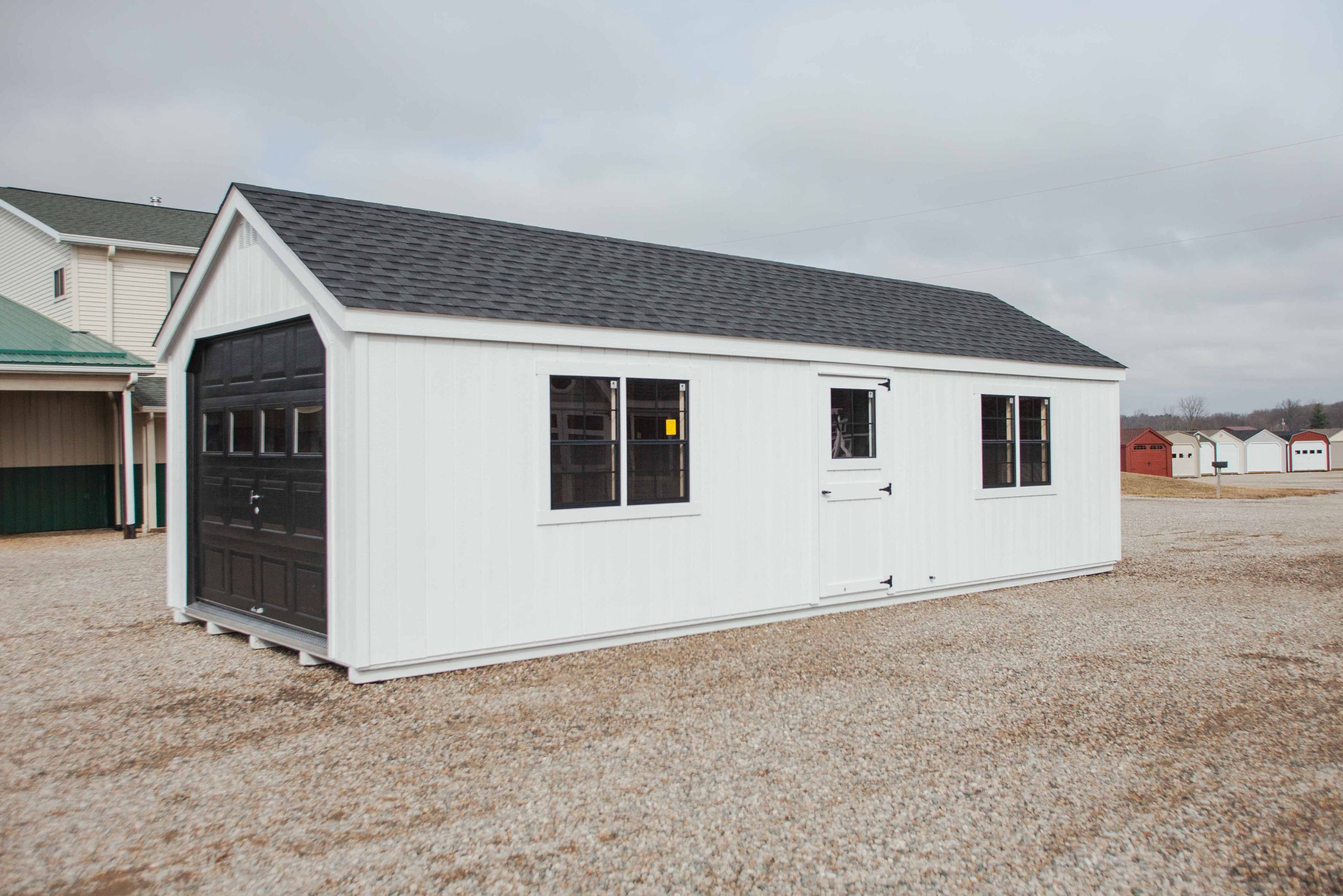 12×30 A-classic Garage, white/white/black, 2 additional 24×36 windows with trim, upgrade to mansion door with 24×24 window, door plates
