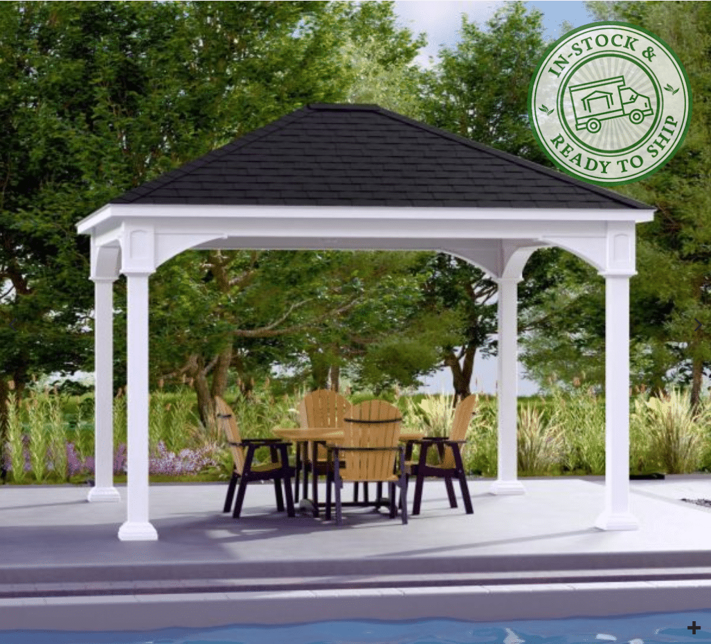 This Pavilion is in stock and ready to be shipped to your home in 1-4 weeks. Transform your outdoor space with the timeless elegance of the 14′ x 18′ White Vinyl Traditional Pavilion, featuring a stunning Mahogany stained ceiling that provides a cool, tranquil atmosphere. Crafted with precision from premium materials, this pavilion boasts 6″ higher posts for added head room. The standard Dual Black shingle roof offers a classic, refined look while ensuring lasting protection. This unit comes in a easy to install kit. Or for an additional $2,725 you can have this unit professionally installed. Category 4 Hurricane ready, and a limited 10 year warranty.