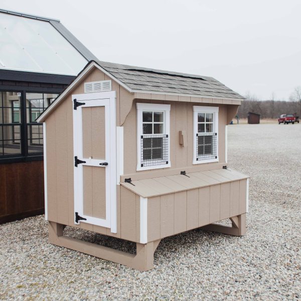 4×6 No Frill Quaker Coop (5×6 overall), buckskin/white/weatherwood, easy clean floor, wire over windows, gable vents and ridge vent