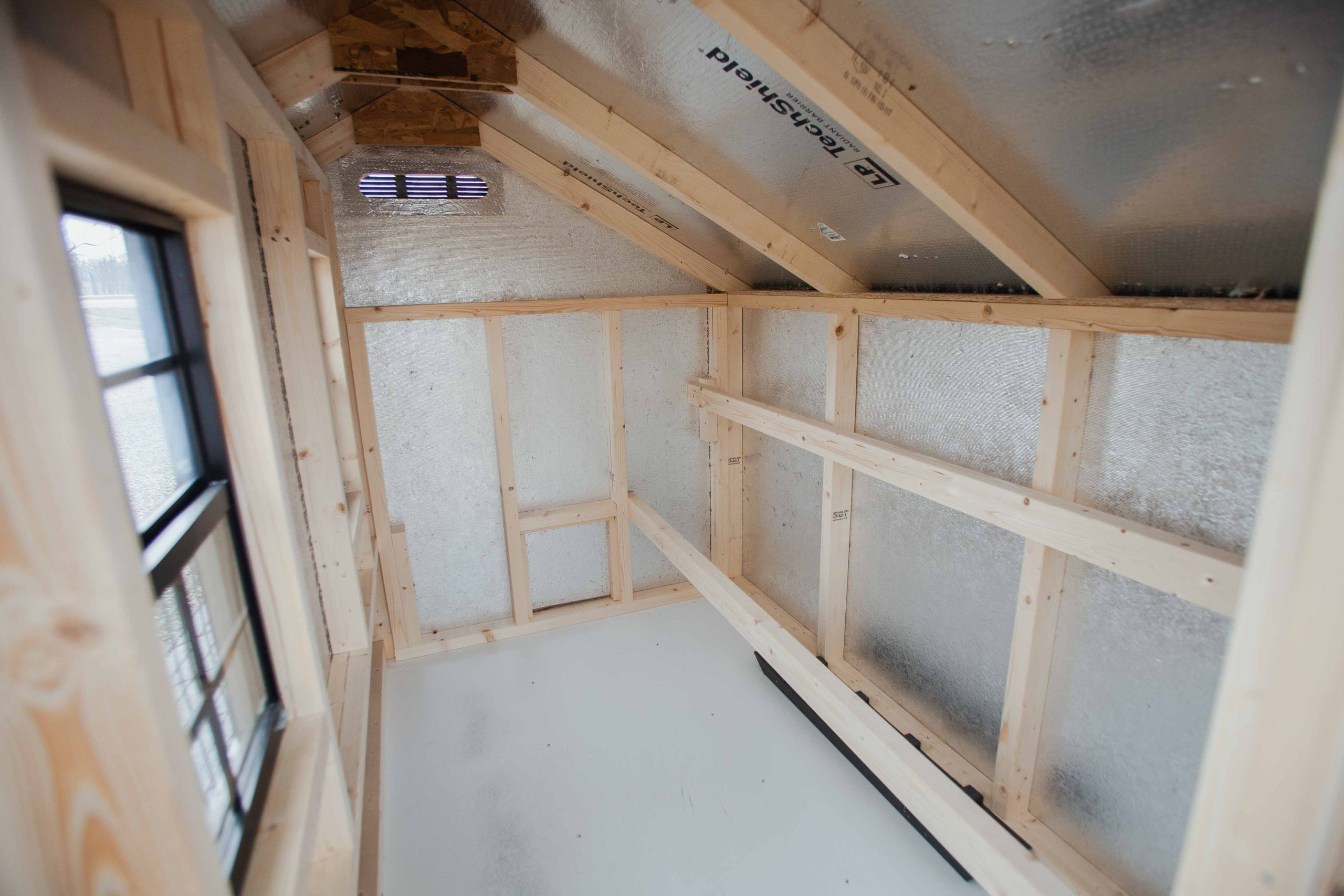 4×6 No Frill Quaker Coop (5×6 overall), iron ore/black/black, easy clean floor, wire over windows, gable vents and ridge vent