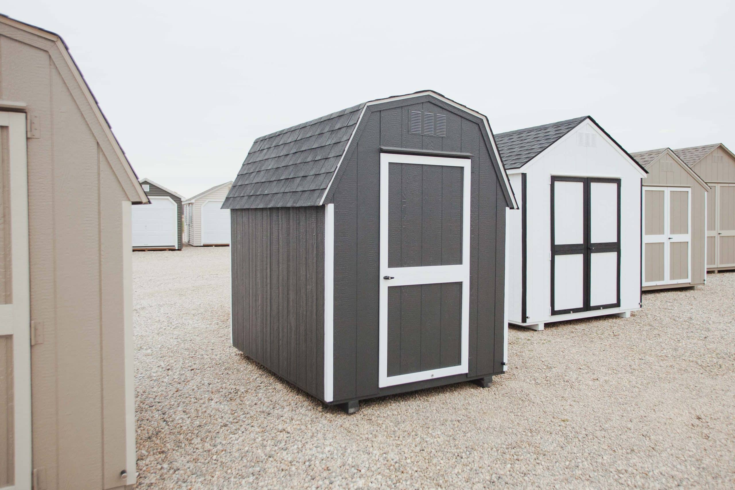 6×8 No Frill 5′ Mini Barn, Iron ore/White/Black, 3′ Single door w/ Door magnet.
