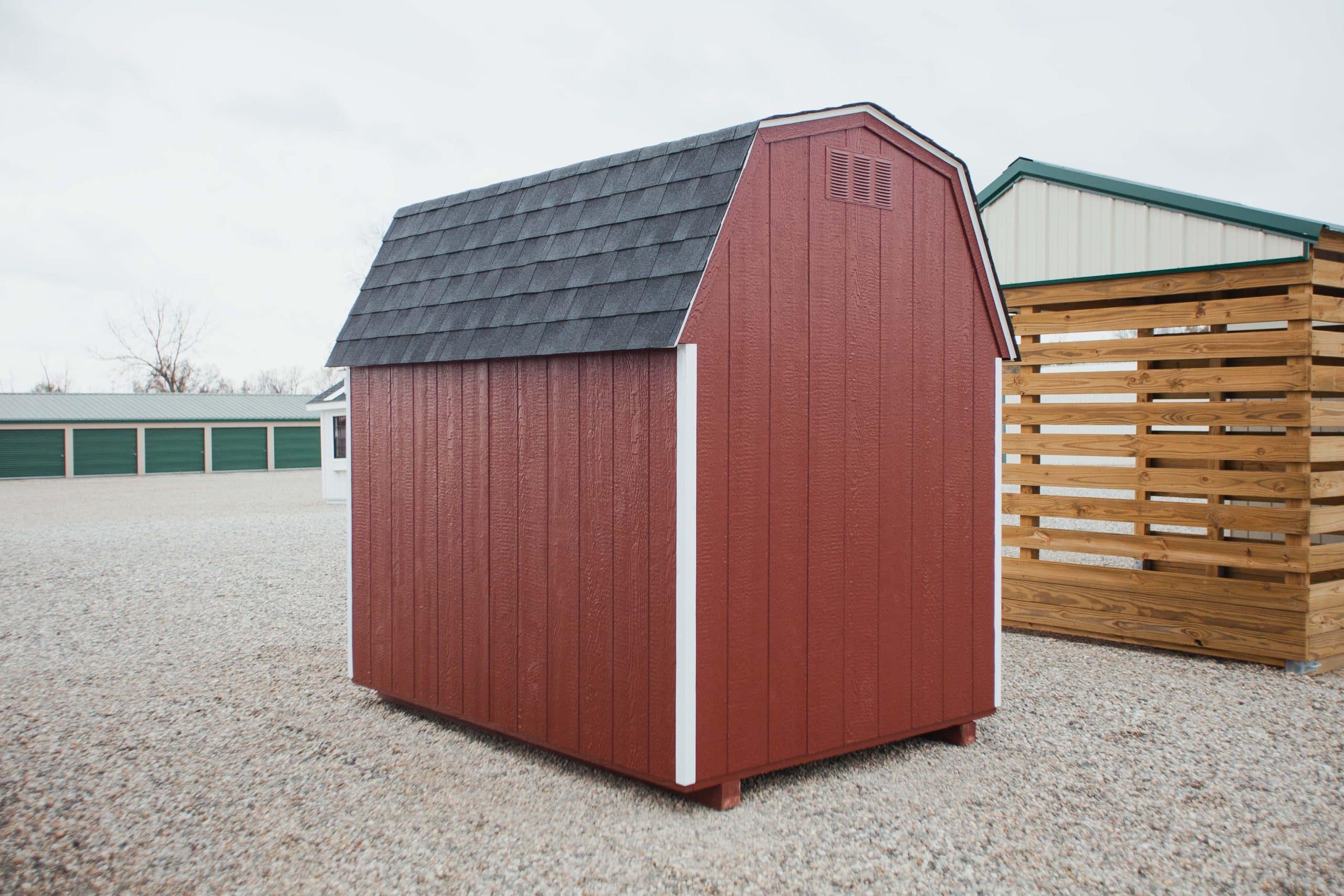 6×8 No Frill 5′ Mini Barn, Red/White/Black, 3′ Single door w/ Door magnet.